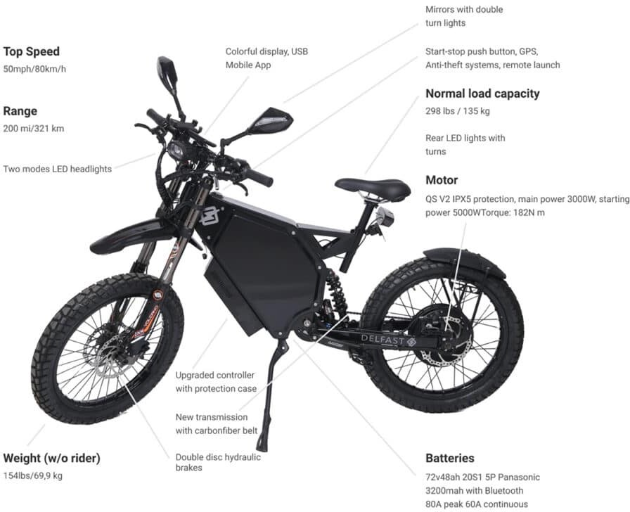 El Delfast Top 3.0 es un híbrido de e-bike/ciclomotor eléctrico de un fabricante ucraniano. La empresa fue fundada en 2017 y ha ganado un Récord Mundial Guinness por la mayor distancia recorrida en una bicicleta eléctrica con una sola carga.