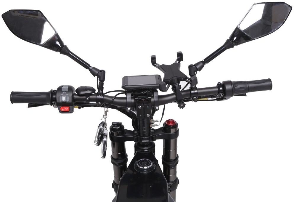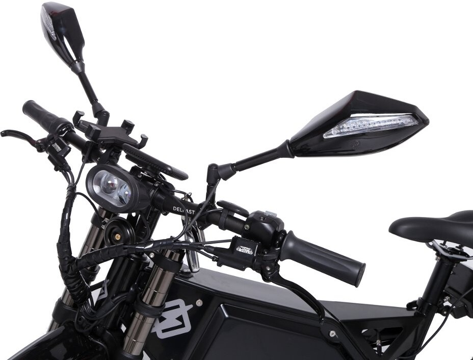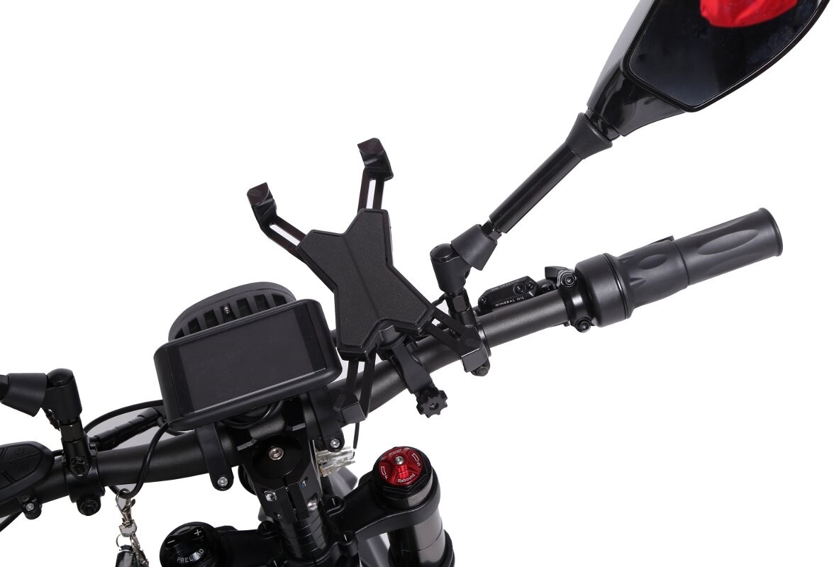 La moto eléctrica cuenta con doble freno de disco delantero y freno de disco trasero para un rendimiento de frenado excepcional, un faro con luces alta y baja, espejos con intermitentes integrados, puertos de carga USB, un soporte para teléfono móvil y una pantalla a color que se conecta a una aplicación móvil.