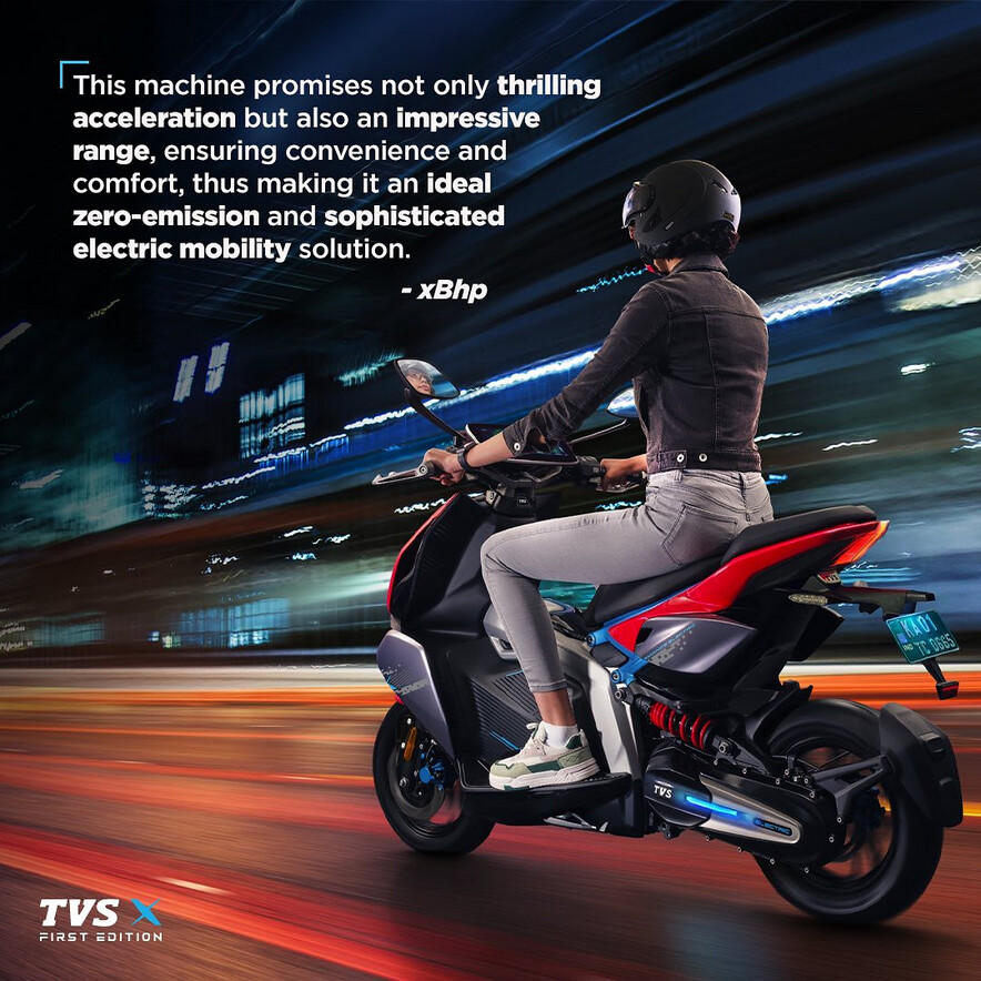 La X es una versión de producción del popular concepto Creon de 2018 Creon que fue diseñado como un scooter de alto rendimiento que acelera más rápido que muchos coches deportivos. El TVS X acelera de 0 a 40 km/h en 2.6 segundos a 0 a 60 km/h en 4.5 segundos. El scooter está diseñado para el mercado global, incluyendo Europa.